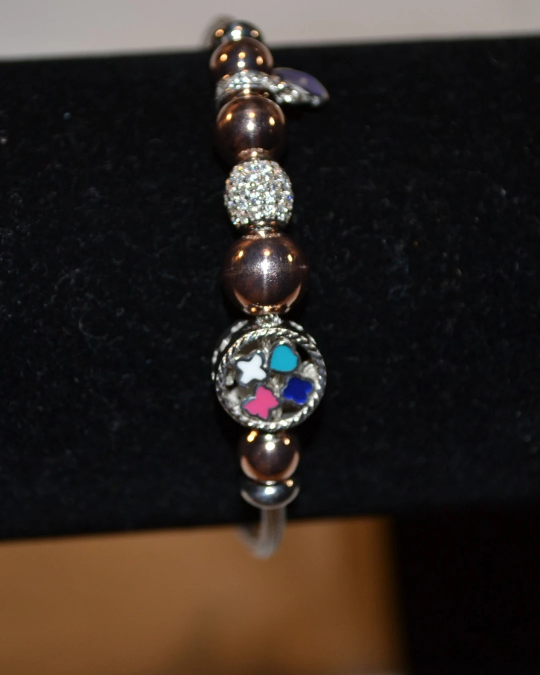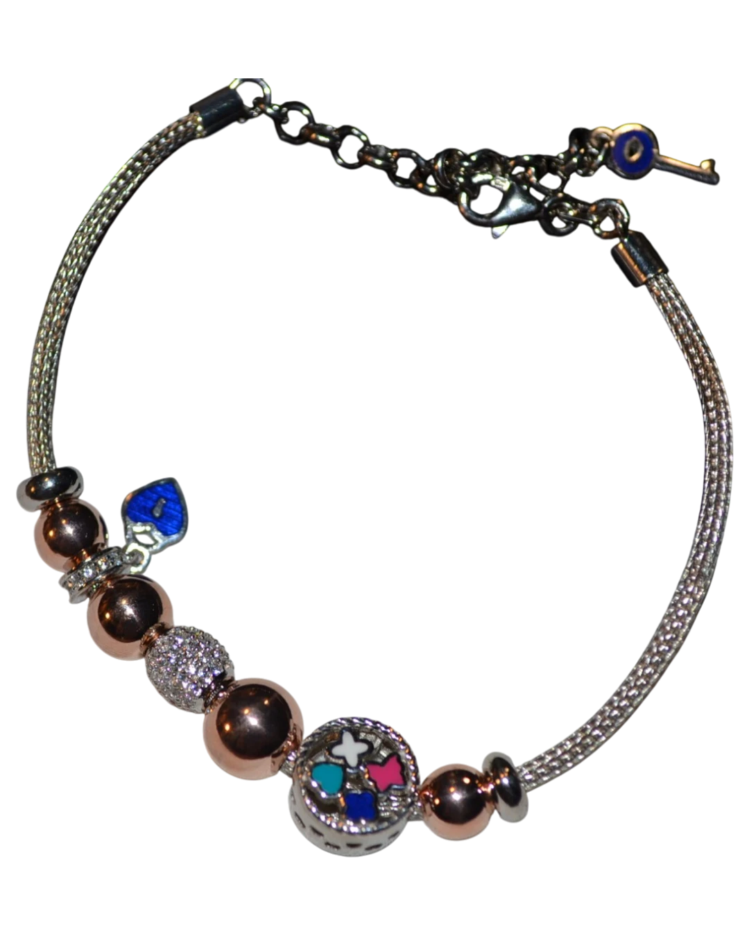 Βραχιόλι ασημένιο μέ τρούκς! Πολύ όμορφο κι’εντυπωσιακό ασήμι και ζιρκόν κι’επισμαλτωμένα στοιχεία μέ επίχρυσες μπιλίτσες. Μήκος 21cm.