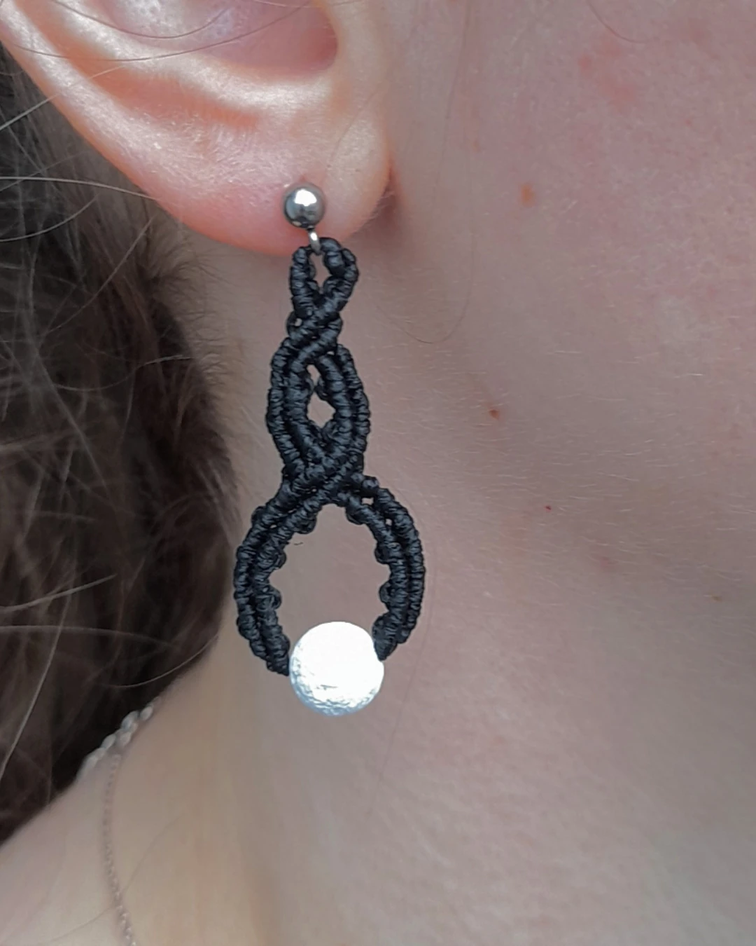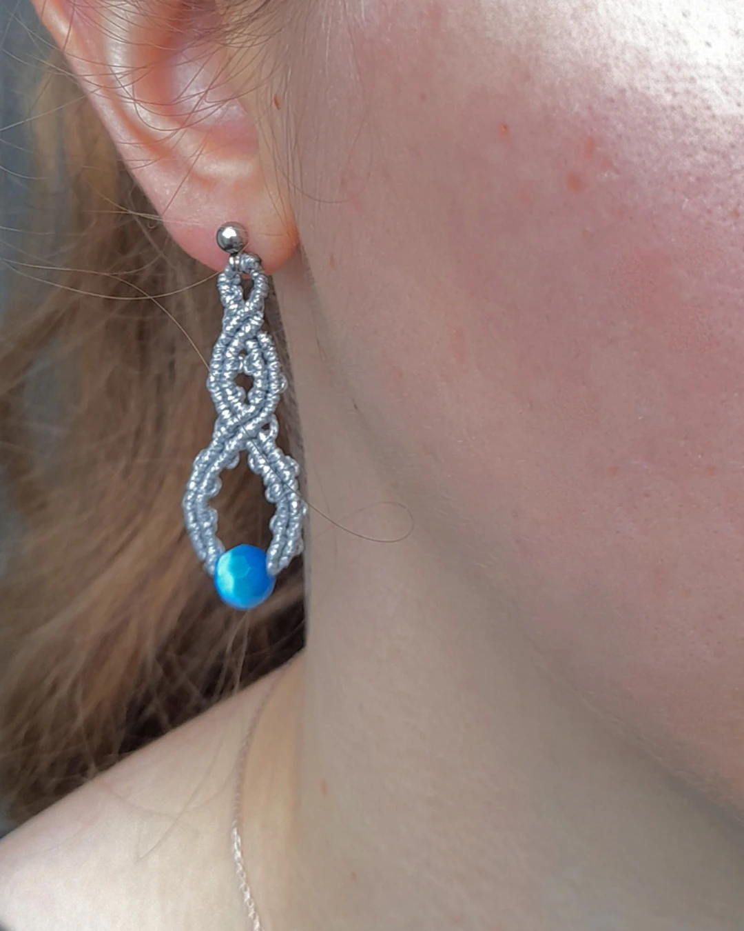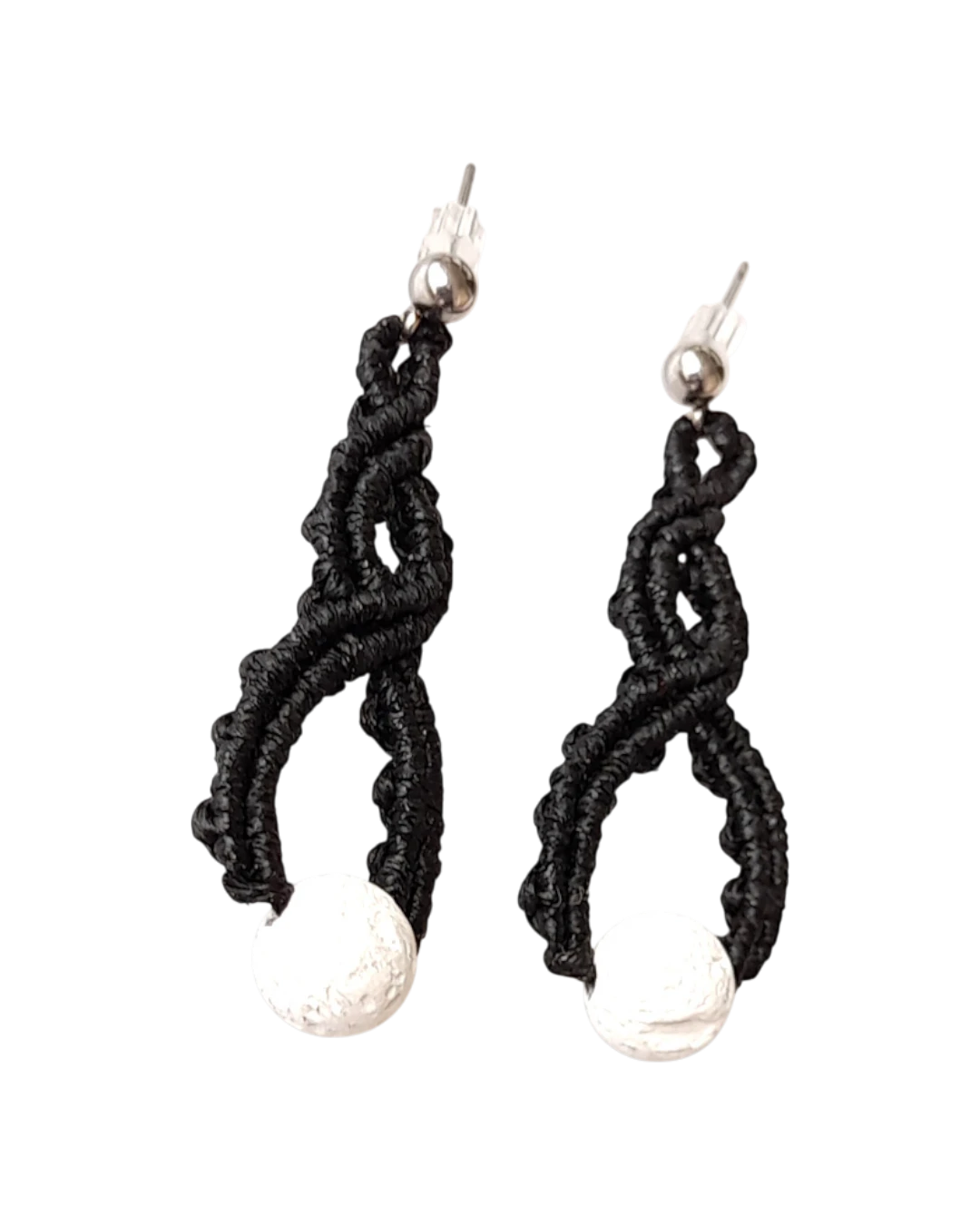 Σκουλαρίκια μακραμέ χειροποίητα! Με κερωμένο νήμα, ηφαιστιακές λάβες ή και ημιπολύτιμες πέτρες. Το κούμπωμα ειναι ατσάλινο καρφάκι υποαλλεργικό. Συνολικό μήκος περίπου 4.5cm. και πλάτος περίπου 1,8cm. Διατίθεται σε 2 συνδυασμούς.